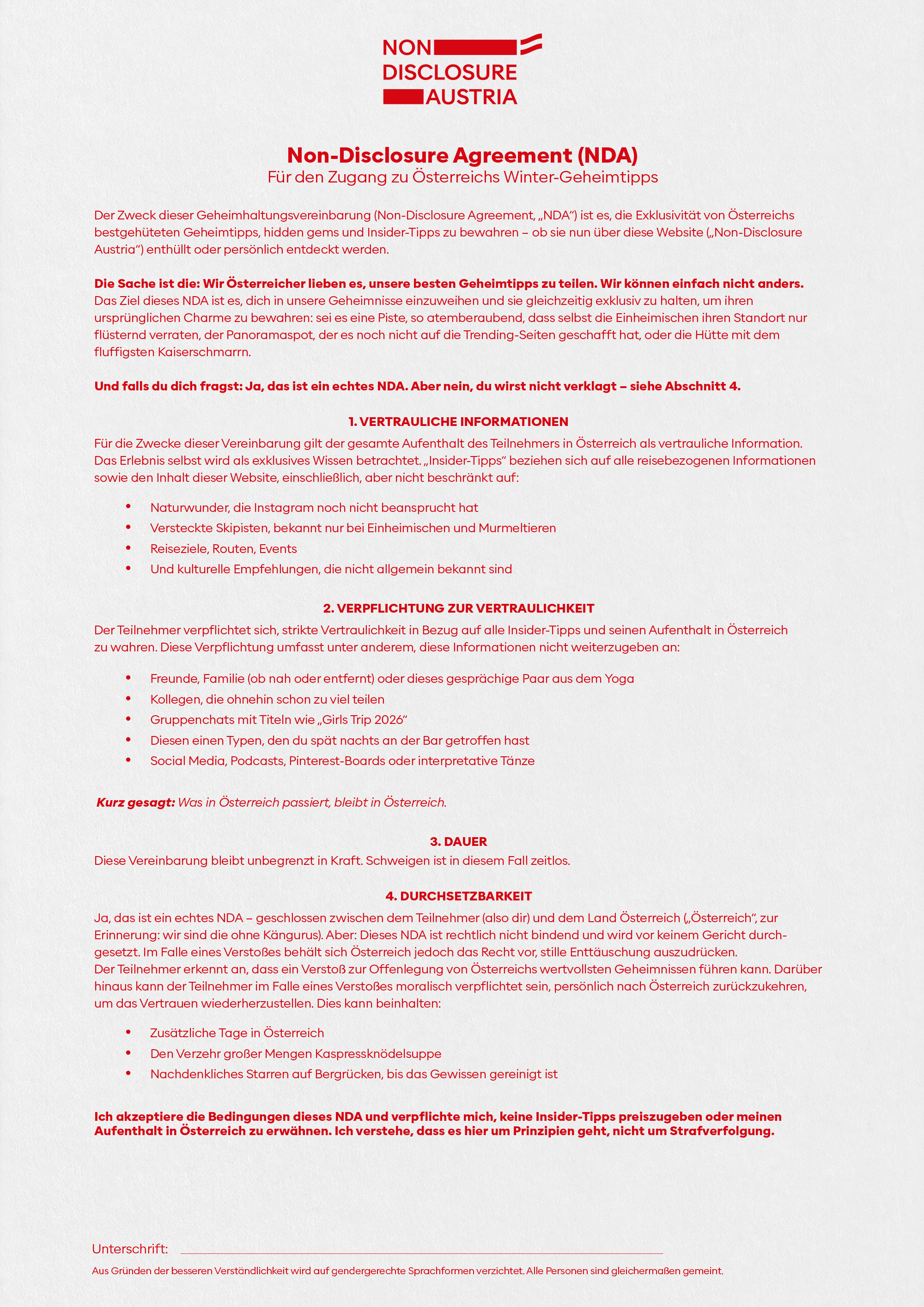 Ein NDA – Non-Disclosure Agreement – ist normalerweise für streng geheime Business-Deals gedacht. Unseres schützt etwas viel Wertvolleres: Österreichs Insider-Tipps. Unterschreib es, und wir verraten dir spezielle Skirouten, Berghütten und verschneite Auszeiten – handverlesen von Österreicher:innen.